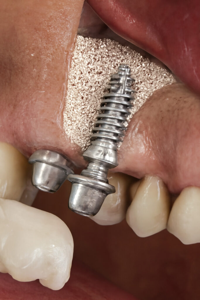The material integrates gradually with host bone over several months. Patients regain proper ridge width and height so implants emerge at the correct angulation and crowns match adjacent teeth perfectly. The procedure also supports facial soft tissues — cheeks and lips maintain natural fullness rather than appearing sunken.
