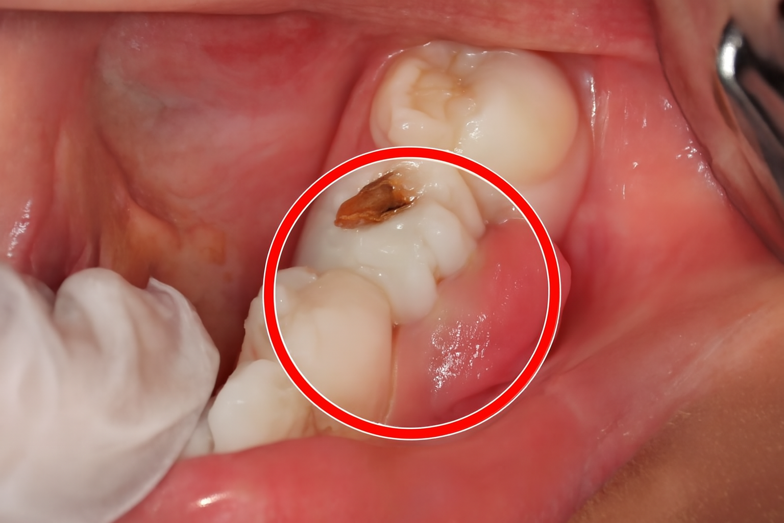 • Tooth discoloration (darkening compared to surrounding teeth)